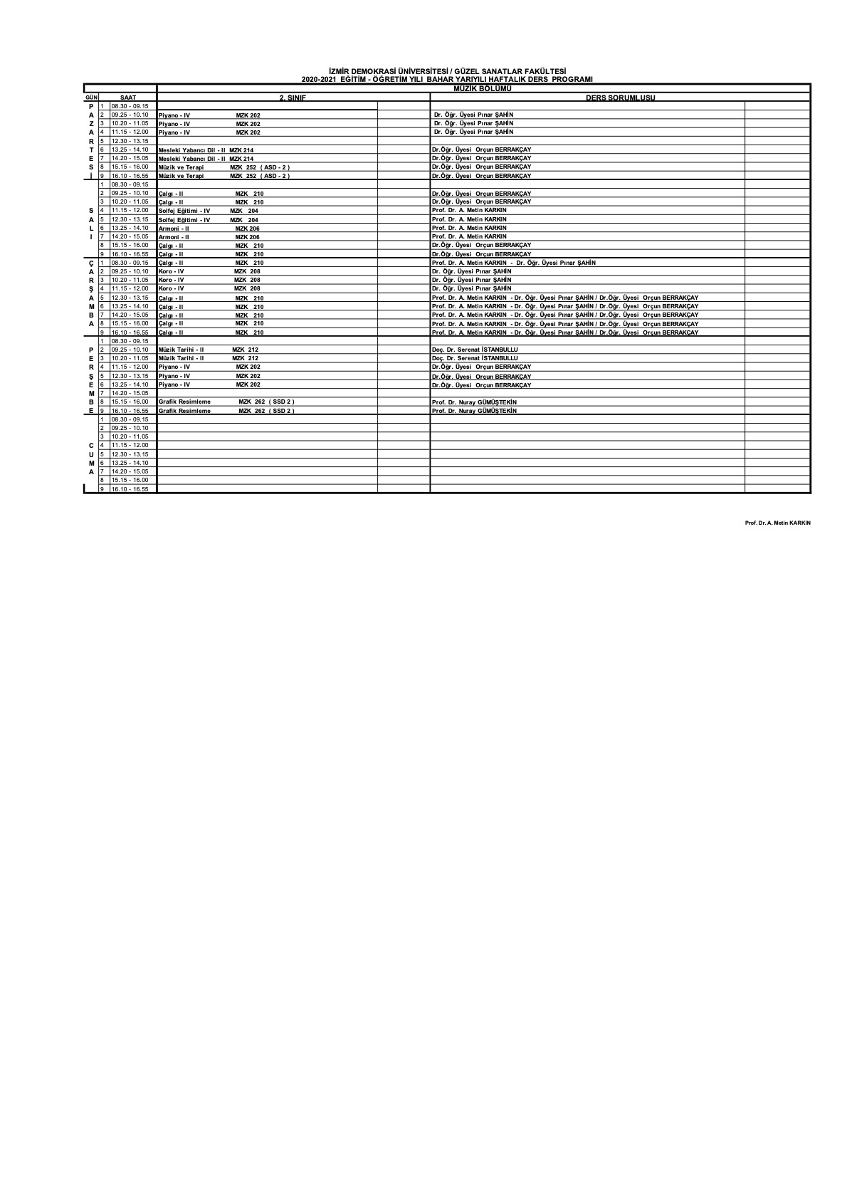 Müzik Bölümü 2020-2021 Bahar Yarıyılı 2. Sınıf Ders Programı