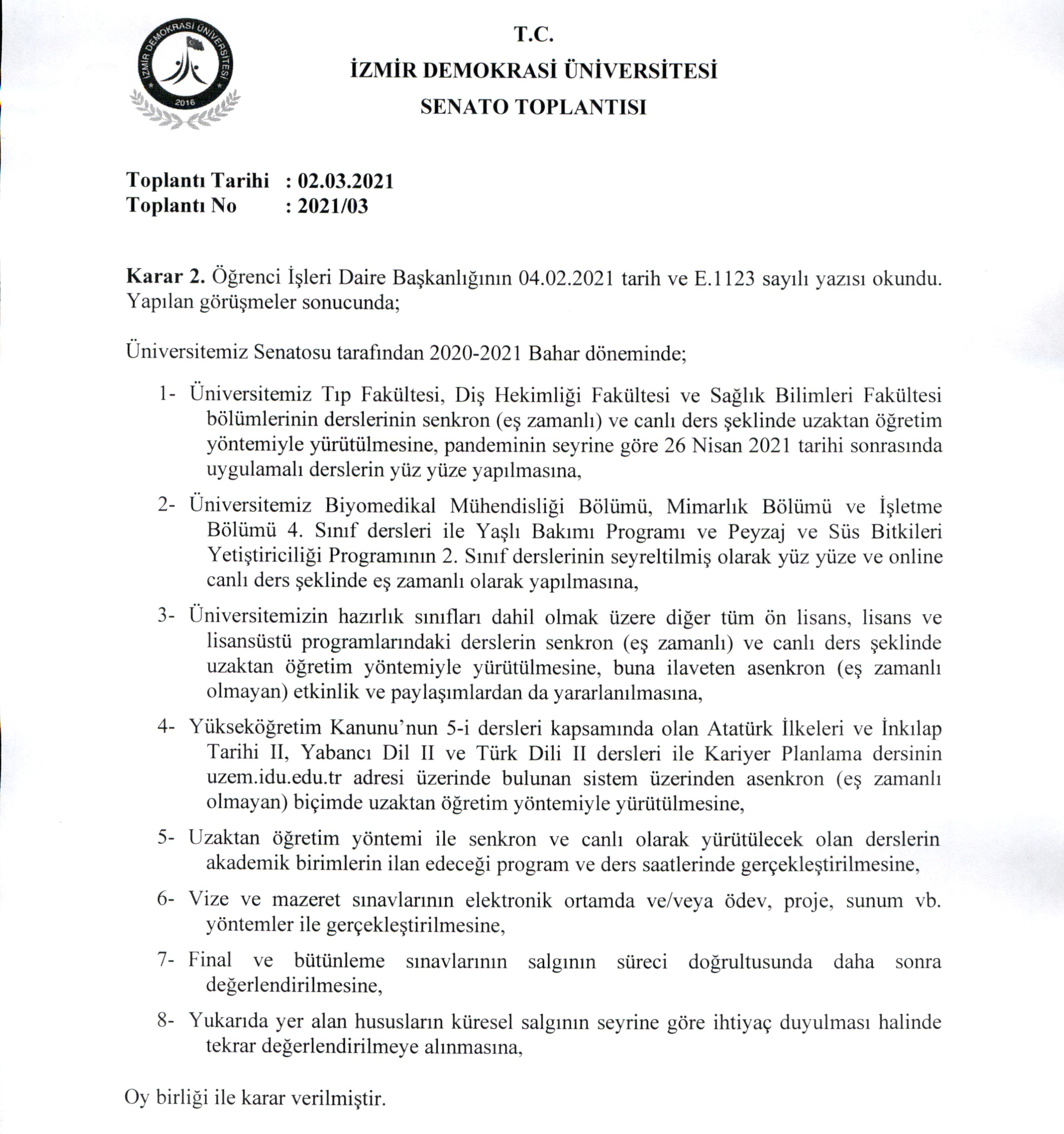 2020-2021 Bahar Eğitim Dönemine Dair Alınan Üniversite Senato Kararına Dair Duyuru