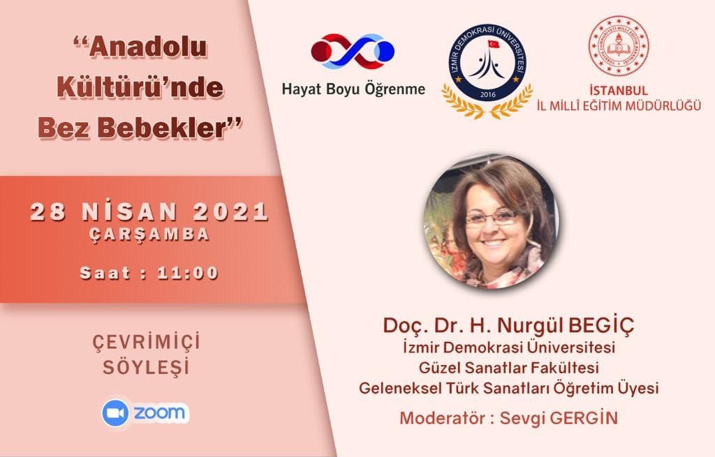 İzmir Demokrasi Üniversitesi Güzel Sanatlar Fakültesi Geleneksel Türk Sanatları Bölüm Başkanı Doç. Dr. H. Nurgül BEGİÇ, 28 Nisan 2021 tarihinde saat: 11:00'de "Anadolu Kültürü'nde Bez Bebekler" konulu çevrimiçi söyleşi gerçekleştirecektir. Afiş için tıklayınız.