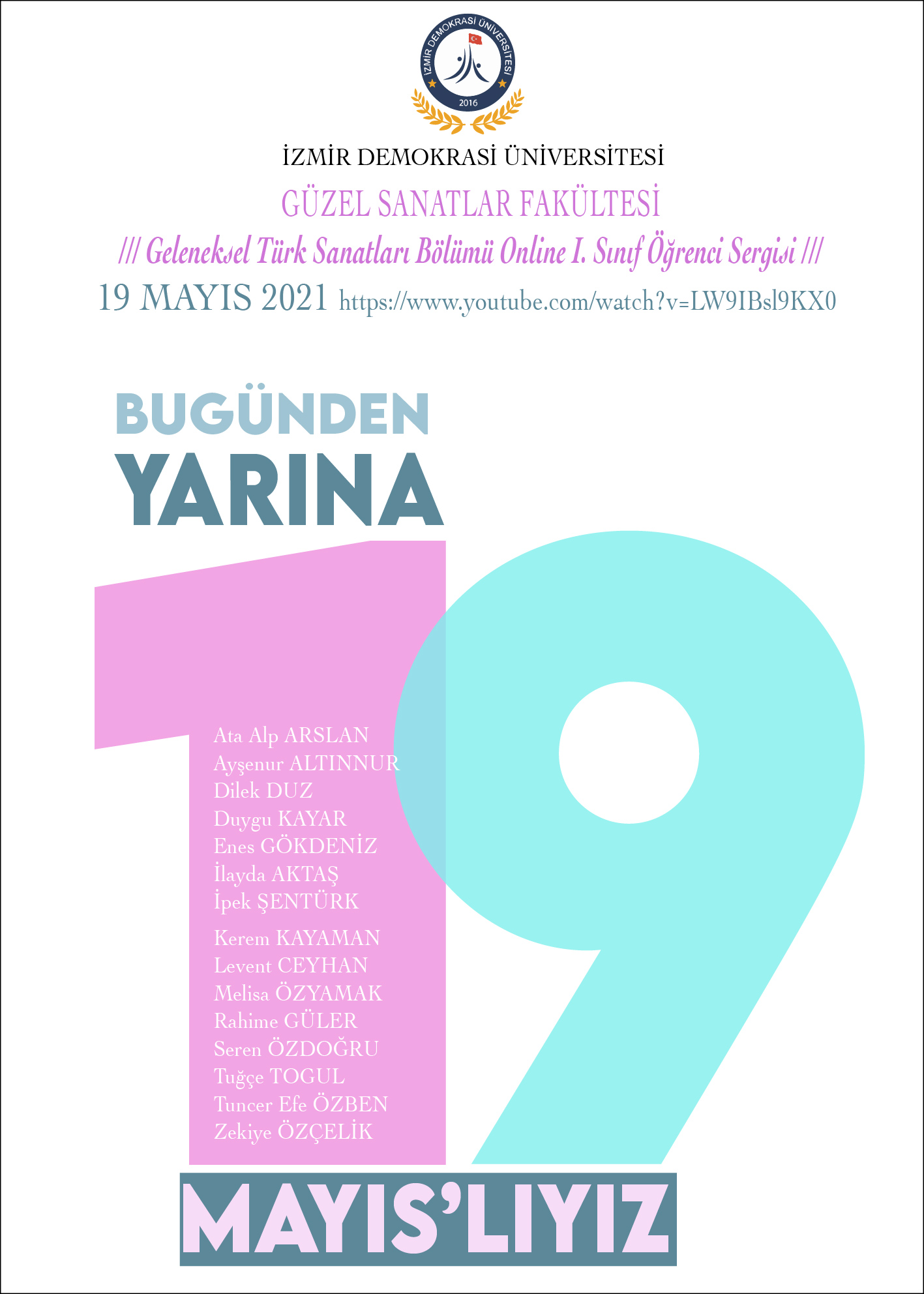 19 Mayıs Atatürk'ü Anma, Gençlik ve Spor Bayramı kapsamında fakültemiz Geleneksel Türk Sanatları Bölümü 1. Sınıf öğrencileri "Bügünden Yarına 19 Mayıs'lıyız" isimli online sergi gerçekleştirmişlerdir. ilgili sergiyi buradan izleyebilirsiniz.